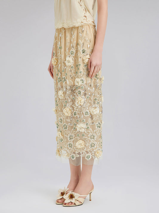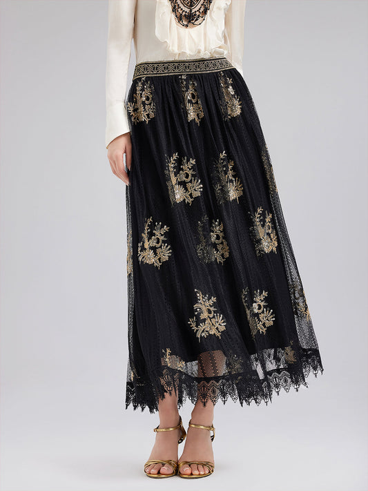 34% İndirimİşlemeli Çiçekli Pullu Şifon Etek