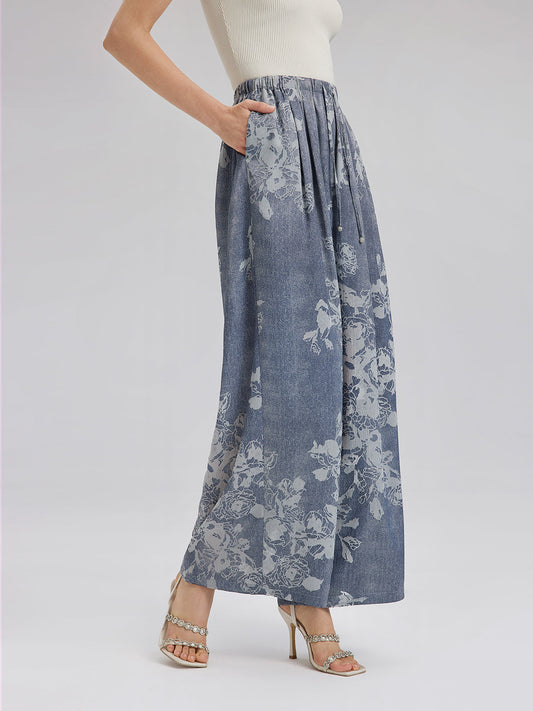 Beli Lastikli Çiçek Desenli Keten Görünümlü Pantolon