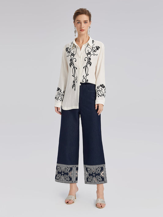 35% İndirimDelik İşlemeli Nakışlı Pamuklu Düz Pantolon
