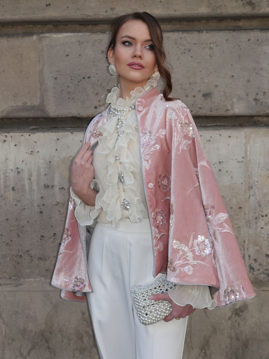 34% İndirimFransız Kadife Boncuklu Nakışlı Pelerin Kaban