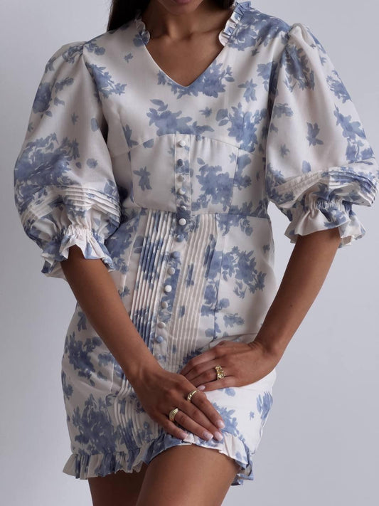 35% İndirimÇiçek Desenli Balon Kol Mini Elbise