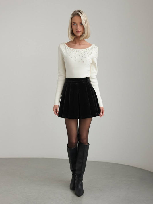 34% İndirimDokulu Ekru Pileli Mini Etek